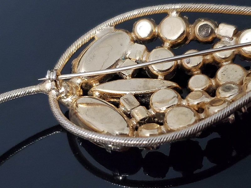 The condition is excellent vintage. All components are original and intact. All rhinestones are free from chips, nicks, cracks, or breaks, No dents or improper bend to metal components. Gold-tone finish intact, front and back. Pin mechanism strong and secure. Clean. No damage / no repairs. Excellent vintage.