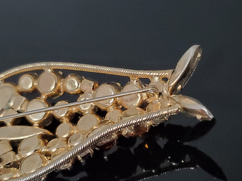 This autumn-colored brooch features rhinestones in smokey quartz, peridot, light, and dark green, citrine, as well as orange. Size, stone cuts, colors, construction, and premium presentation are in full bloom. We think an earlier work -- circa 1950-1954.