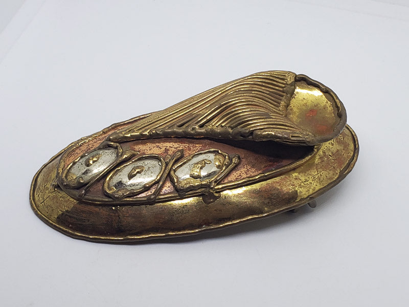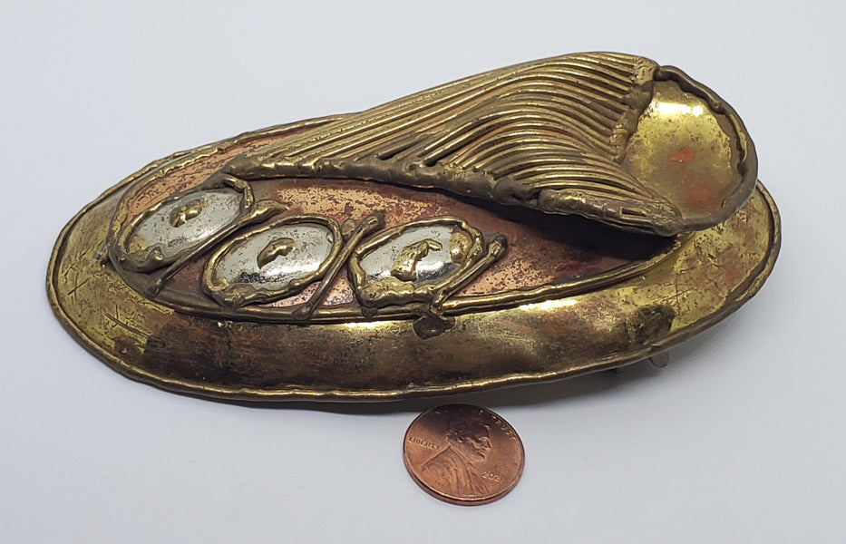 Please see the pictures for exact details as this is the item you will receive. Believed to be a mix of brass, copper, and a type of silver. It is 4.8 inches in length and is 2.5 inches wide.